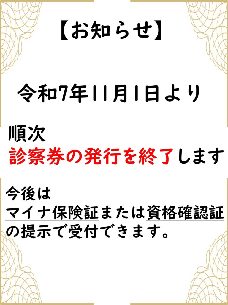 令和7年11月1日(土)より、下記の通り、診察券の発行を終了いたします。