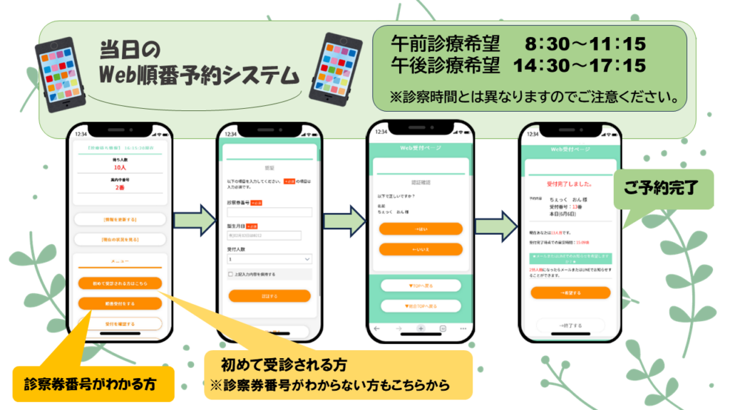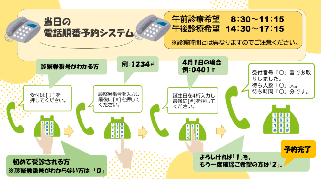 当院の順番予約システムはWebか電話番号(050-)での方法があります。