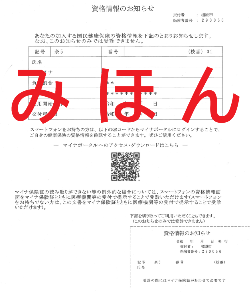 マイナ保険証利用時にトラブルが発生した時には、マイナ保険証のご提示+資格情報のお知らせ(以下の書面のもの)のご提示で、確認することができます。