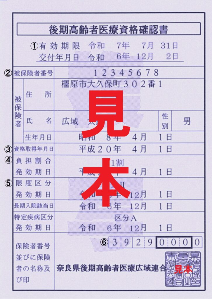 75歳以上の後期高齢者の方は、マイナ保険証か後期高齢者医療資格確認書をご持参ください。被保険者番号(②)や資格取得年月日(③)の記載の他、負担区分(➃)や限度区分(⑤)の記載があります。